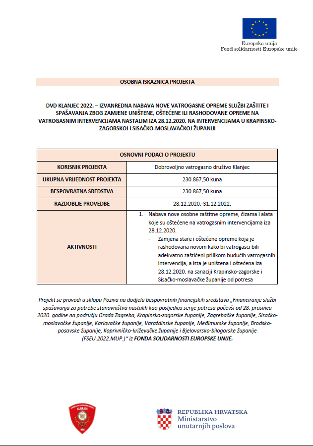 DVD Klanjec prijavio je projektni prijedlog unutar Poziva na dodjelu bespovratnih financijskih sredstava “Financiranje službi spašavanja za potrebe stanovništva nastalih kao posljedica serije potresa počevši od 28. prosinca 2020. godine na području Grada Zagreba, Krapinsko-zagorske županije, Zagrebačke županije, Sisačko-moslavačke županije, Karlovačke županije, Varaždinske županije, Međimurske županije, Brodsko-posavske županije, Koprivničko-križevačke županije i Bjelovarsko-bilogorske županije” pod nazivom “DVD Klanjec 2022.-Izvanredna nabava nove vatrogasne opreme službi zaštite i spašavanja zbog zamjene uništene, oštećene ili rashodovane opreme na vatrogasnim intervencijama nastalim iza 28.12.2020. na intervencijama u Krapinsko-zagorskoj i Sisačko-moslavačkoj županiji”